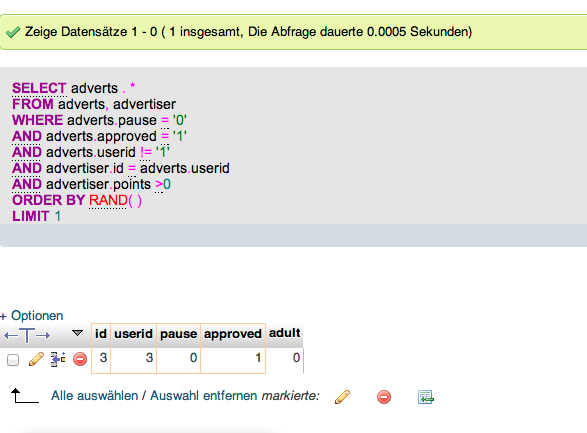 Code:SELECT adverts . * FROM adverts, advertiser WHERE adverts.pause = '0' AND adverts.approved = '1' AND adverts.userid != '1' AND advertiser.id = adverts.userid AND advertiser.points >0 ORDER BY RAND( ) LIMIT 1