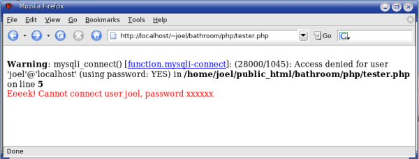 The @ in front of the function name is used to suppress any error messages on failure. For example, without the @, if we entered an incorrect password, we'd get the following error message when we point our browser to it (tester.php is what we named our file):