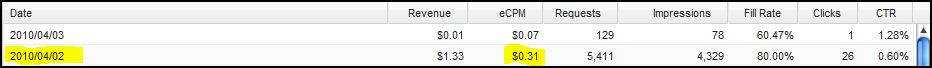 yesterday is my lucky day. 2010-04-02, $0.31eCPM from Admob. this is my maximum eCPM